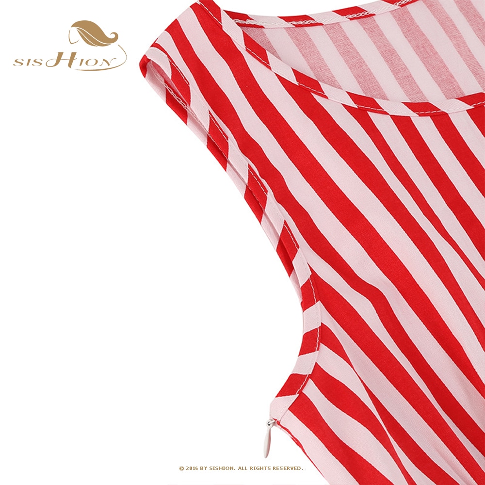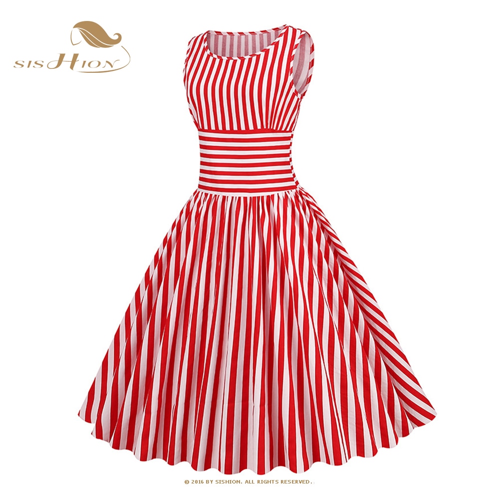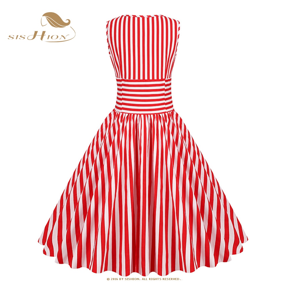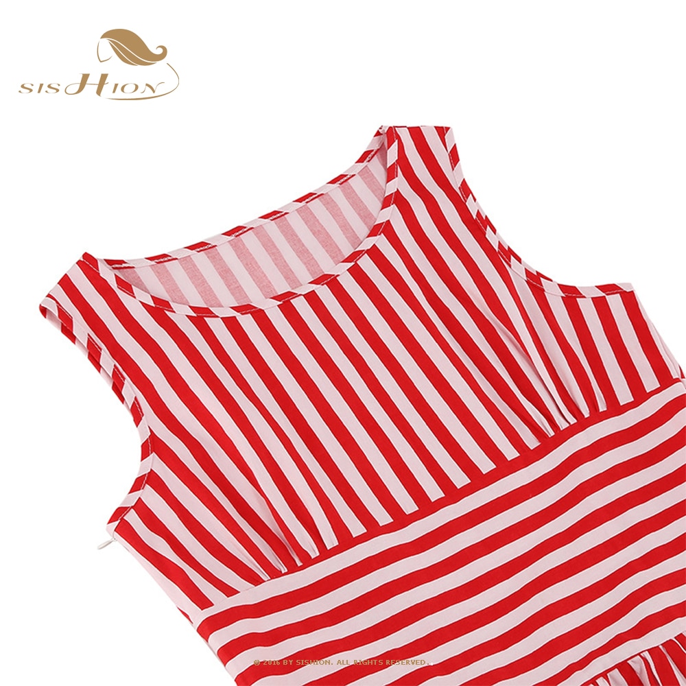 Red White Striped High Waist Rockabilly Vintage Cotton Dresses Women O-Neck Sleeveless Pinup 50s Pleated Dress VD3332