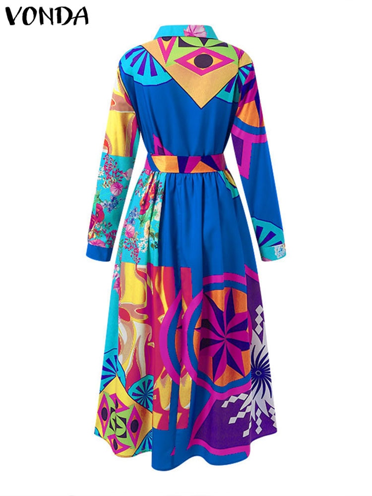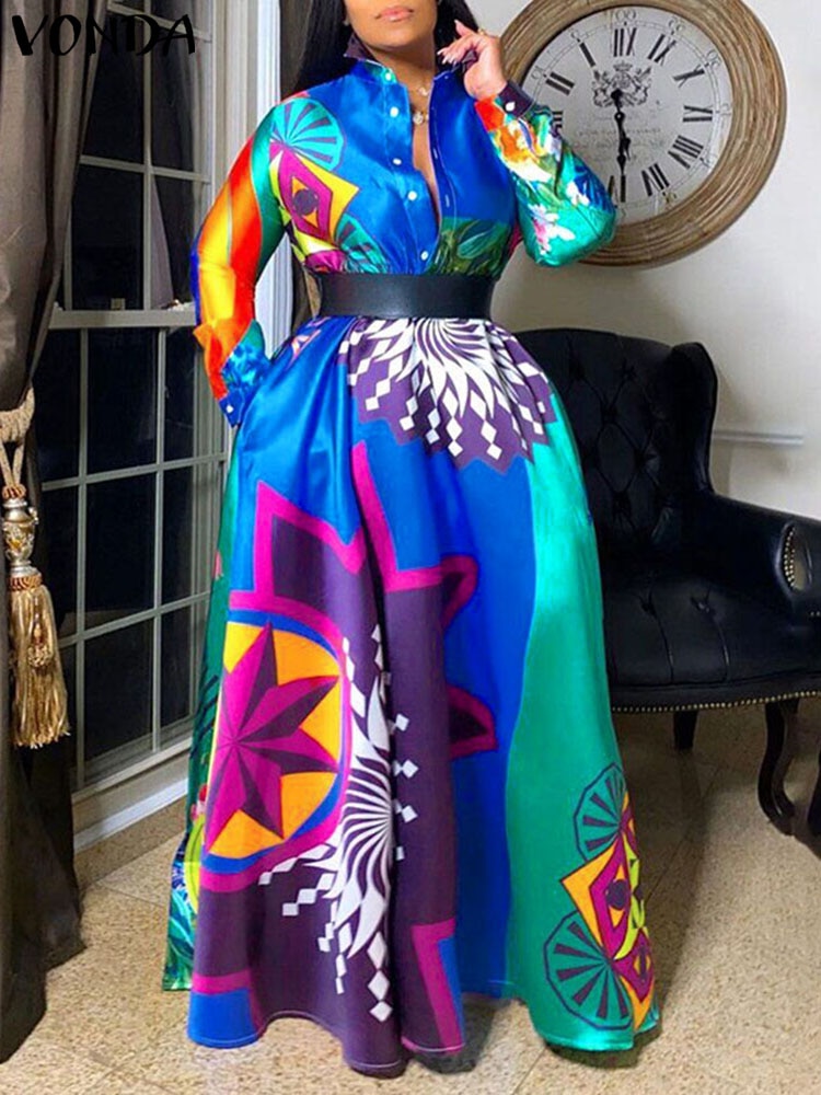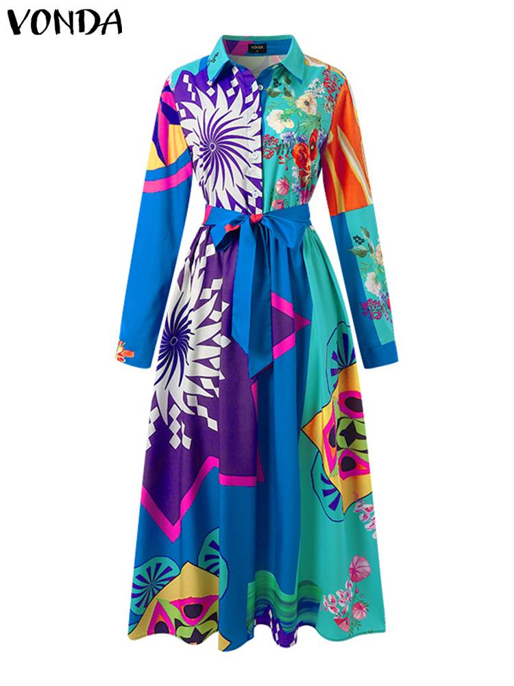 فستان بطيات بوهيمي مطبوع من فوندا لعام 2022 فستان نسائي طويل بأكمام طويلة بأزرار أنيقة وفضفاضة للحفلات
