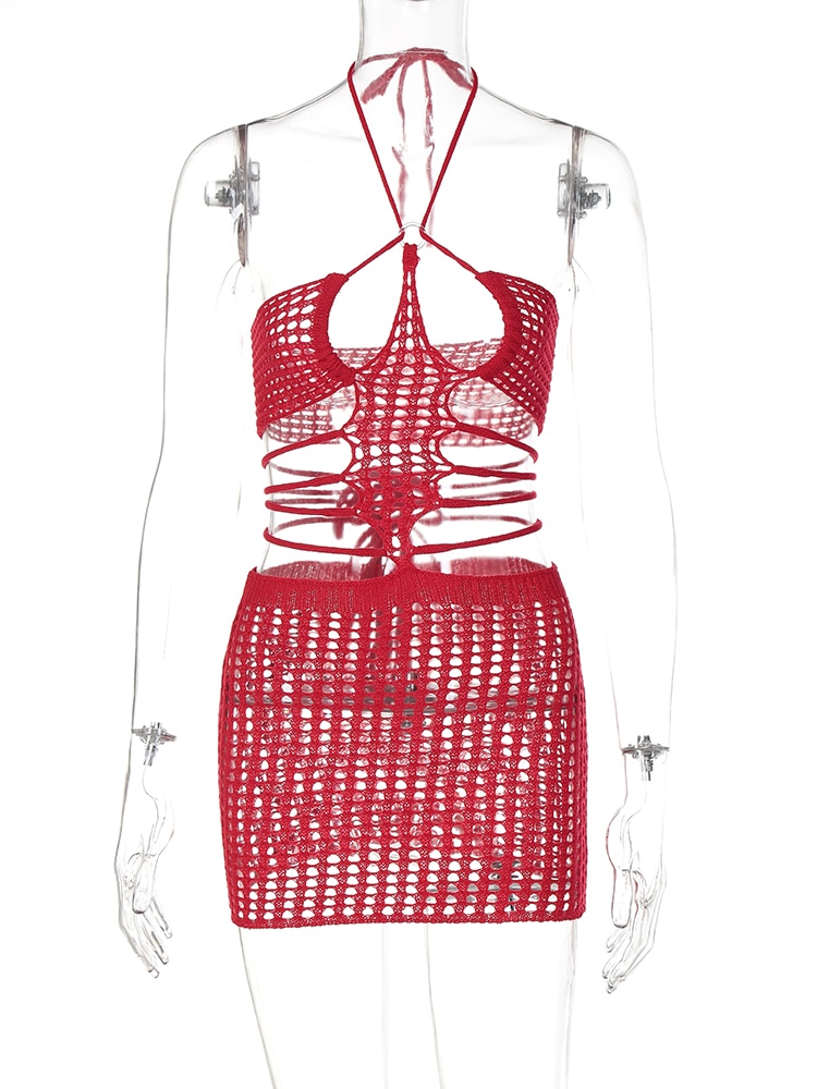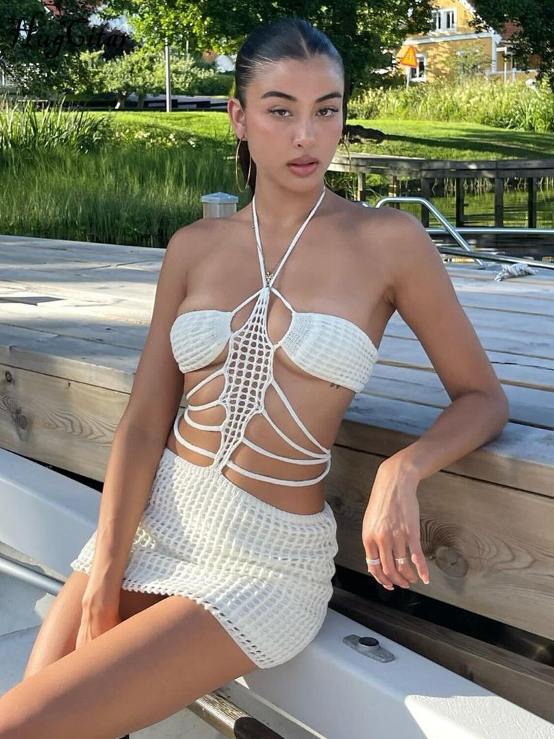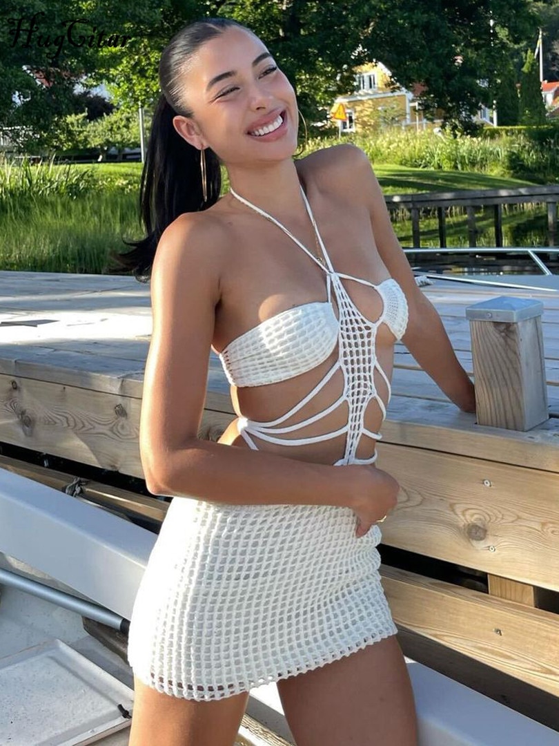 فستان نسائي صيفي ضيق بدون أكمام بأربطة مفرغة من Hugcitar فستان نسائي صيفي قصير مثير ملابس نادي باتش رافيلينج