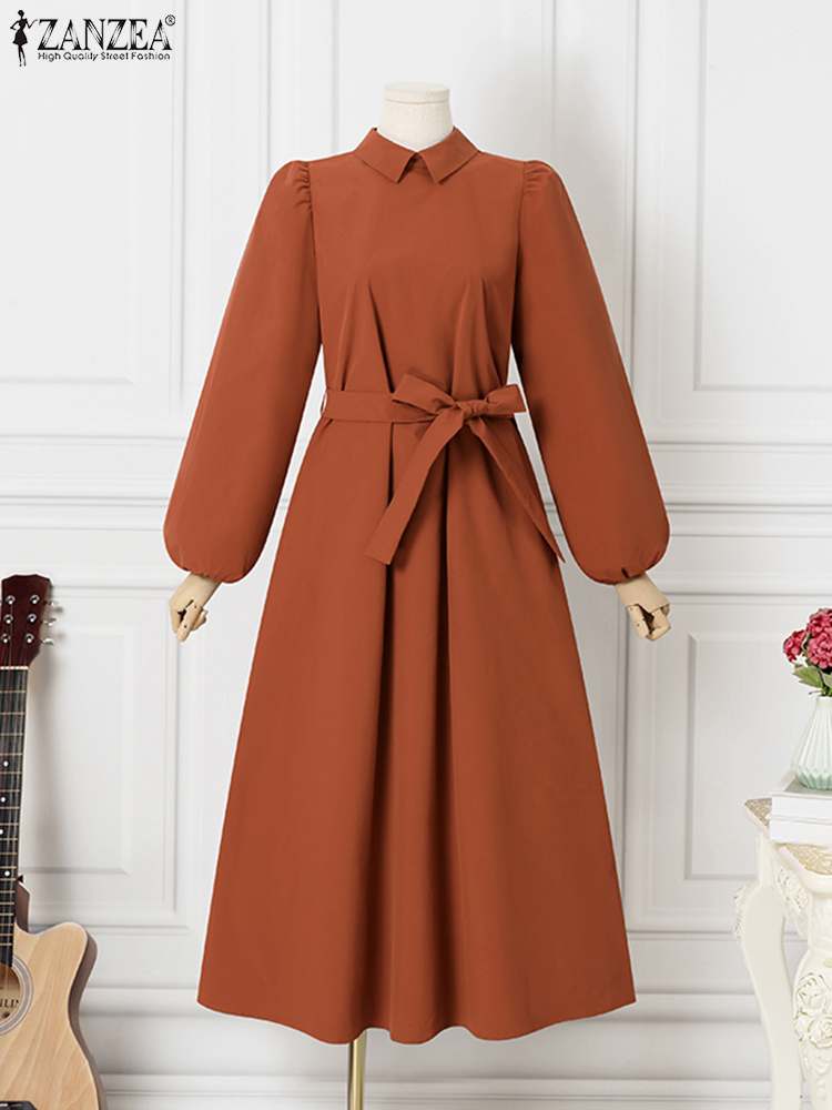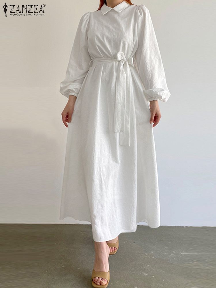 فستان نسائي طويل من ZANZEA أنيق بأكمام طويلة منتفخ فساتين حفلات غير رسمية بحزام بلون سادة