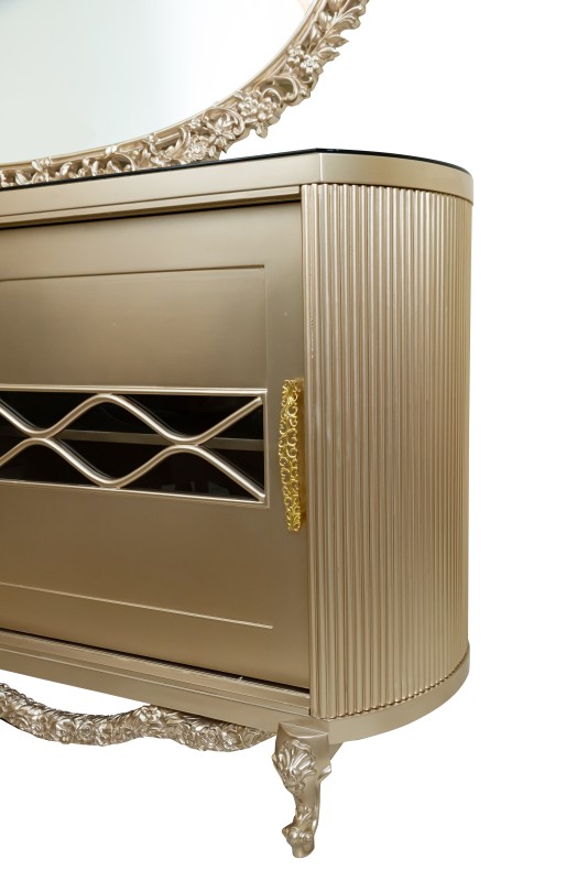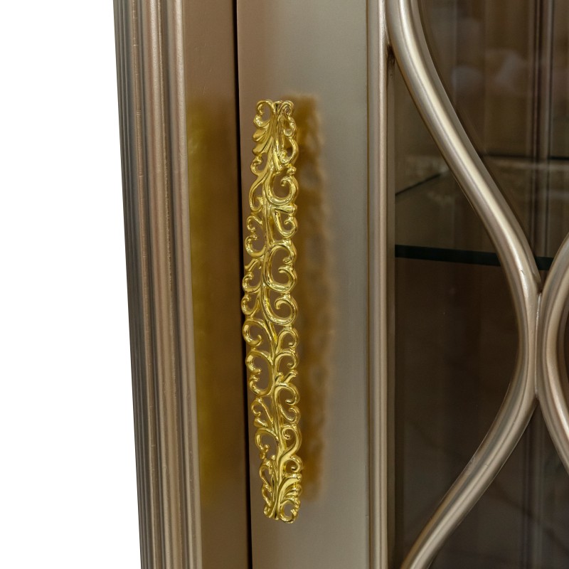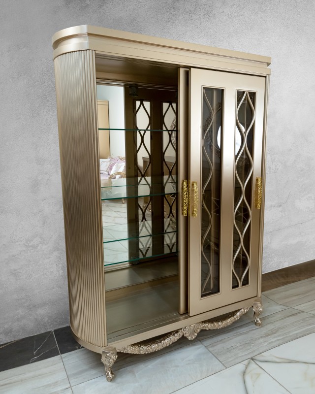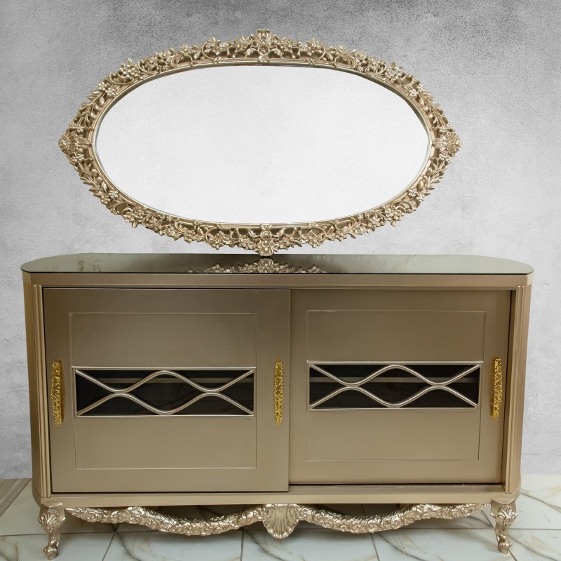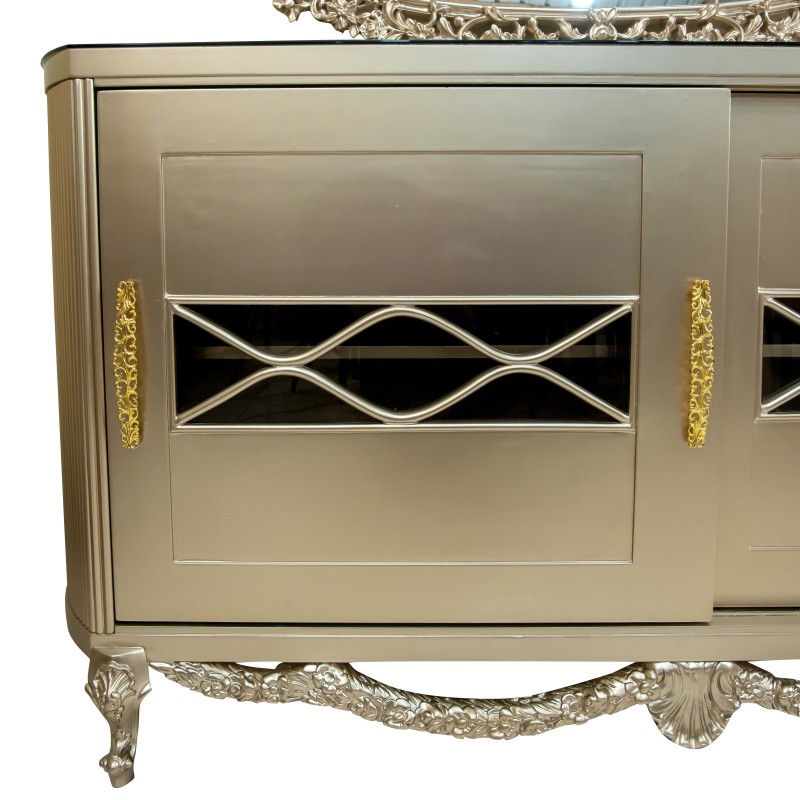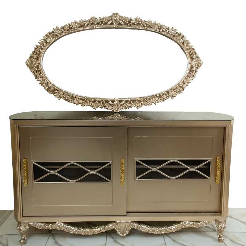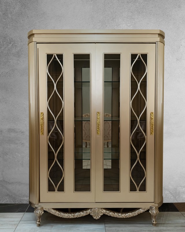 مصنعة بالكامل من اجود الاخشاب الطبيعية أبلكاش روسي و الاحمال خشب زان و دهان شامبين ذهبي مكونة من بوفيه ٢ درفة جرار زجاج ملون دهان داخلي مثل الخارجي بمقاس عرض ٢م ارتفاع ١٠٠ سم عمق ٦٠ سم برواز زهور نيش ٢ درفة جرار زجاج ملون ٣ رف زجاجي ظهر مرايا دهان خارجي مثل الخارجي بمقاس ١٤٥ سم عرض عمق ٦٠ سم ارتفاع ٢١٠ سم ترابيزة بمقاس ٢ م *ام ٦ كرسي من الخشب الزان رجول أويما زجاج ملون للغرفة بالكامل