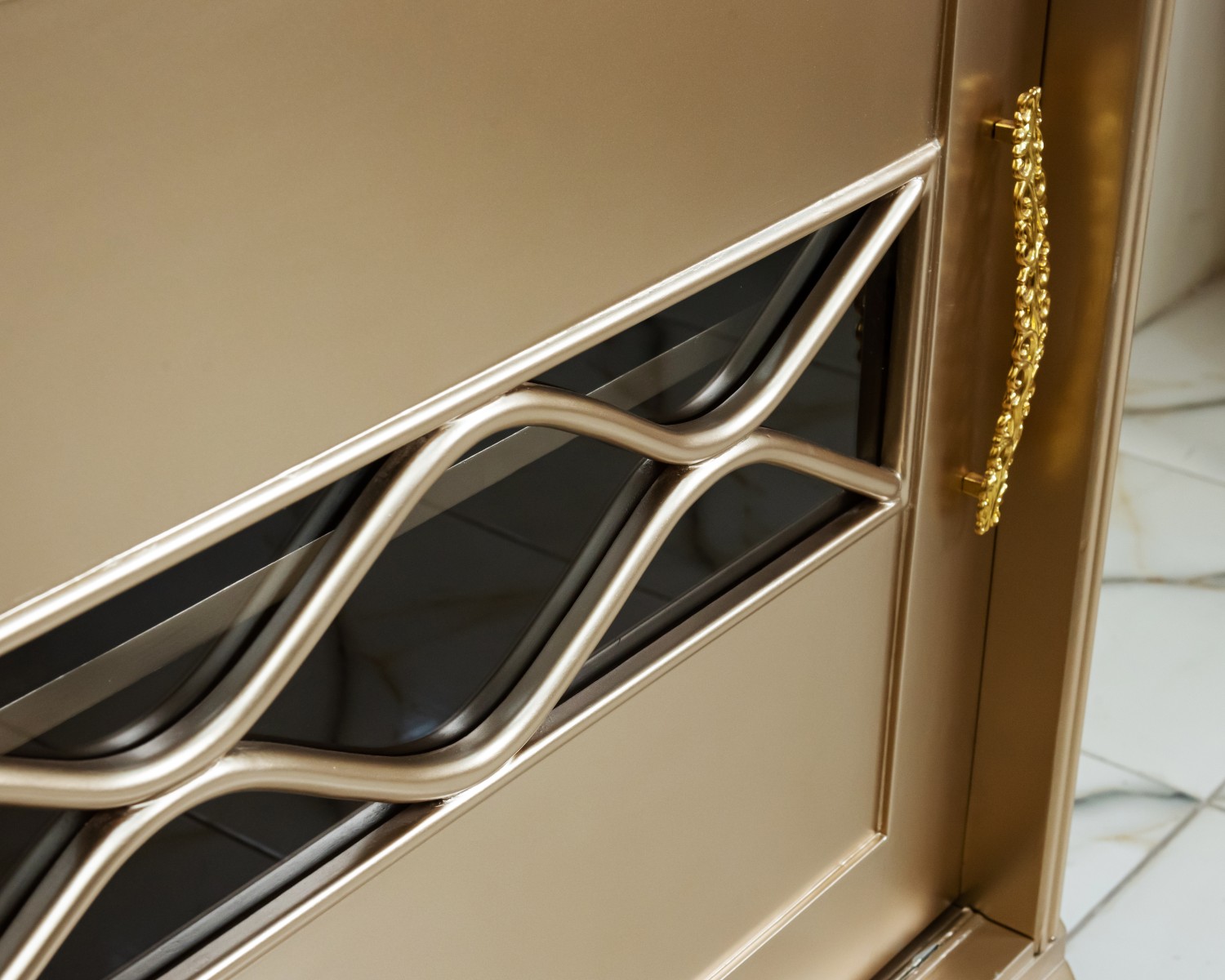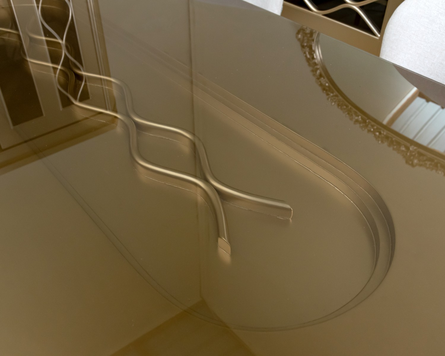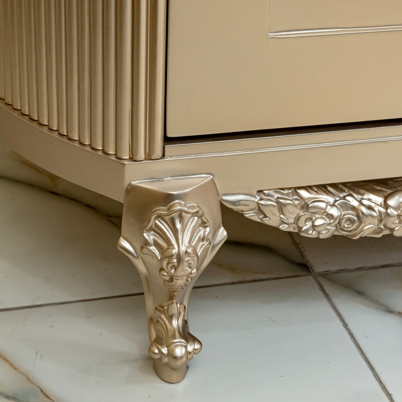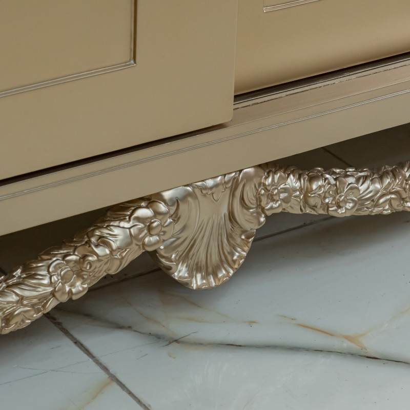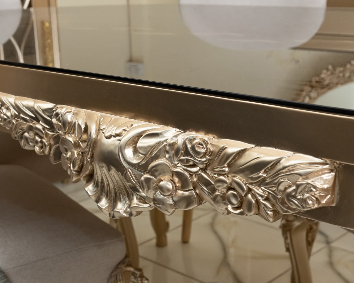 مصنعة بالكامل من اجود الاخشاب الطبيعية أبلكاش روسي و الاحمال خشب زان و دهان شامبين ذهبي مكونة من بوفيه ٢ درفة جرار زجاج ملون دهان داخلي مثل الخارجي بمقاس عرض ٢م ارتفاع ١٠٠ سم عمق ٦٠ سم برواز زهور نيش ٢ درفة جرار زجاج ملون ٣ رف زجاجي ظهر مرايا دهان خارجي مثل الخارجي بمقاس ١٤٥ سم عرض عمق ٦٠ سم ارتفاع ٢١٠ سم ترابيزة بمقاس ٢ م *ام ٦ كرسي من الخشب الزان رجول أويما زجاج ملون للغرفة بالكامل