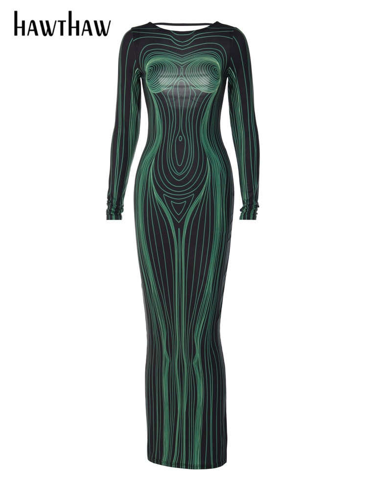 Hawthaw نساء موضة كم طويل Bodycon الشارع الشهير حفلة نادي أخضر فستان طويل 2022 ملابس خريفية بيع بالجملة لرجال الأعمال