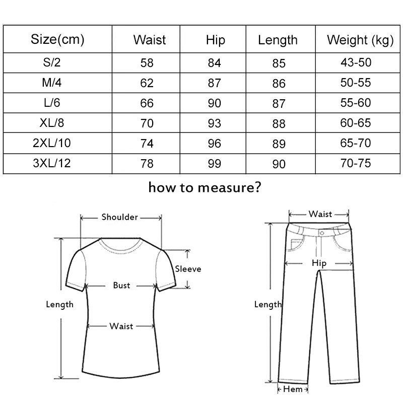 2XL = الخصر 74 سنتيمتر ، الورك 96 سنتيمتر ، طول 89 سنتيمتر ، لوزن 65-70 كجم.
