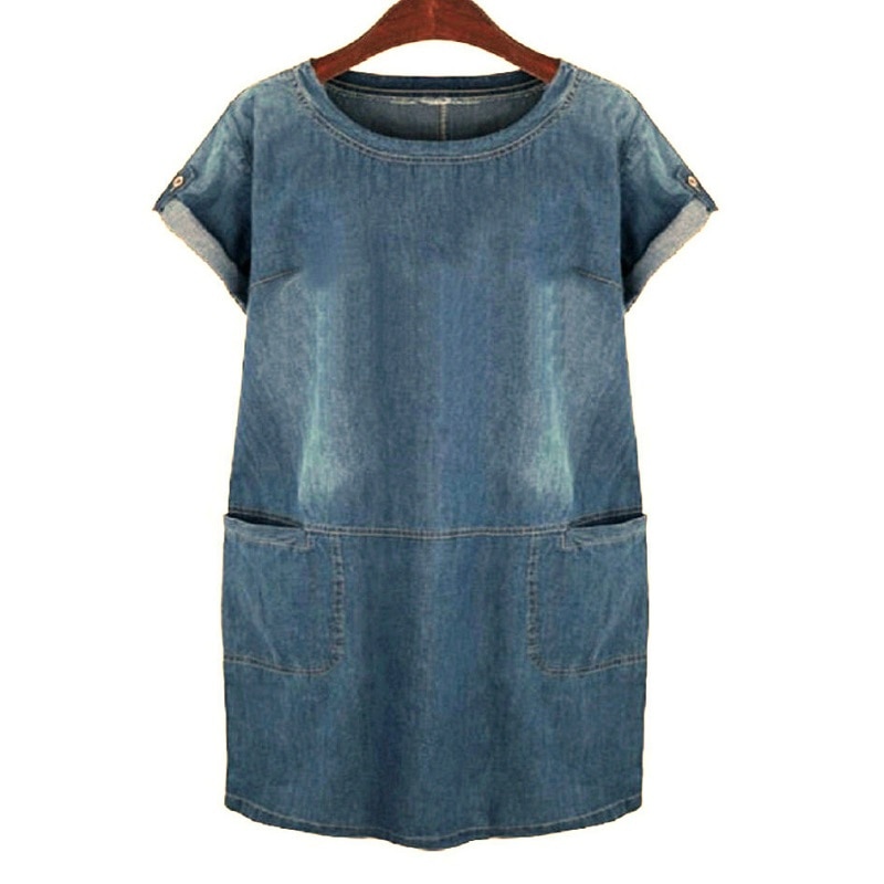 حجم كبير 5xl المرأة فستان ريترو بلون الرقبة المستديرة جيب قصيرة الأكمام سيدة فستان صيفي الدنيم المواد فساتين ذات نوعية جيدة:
