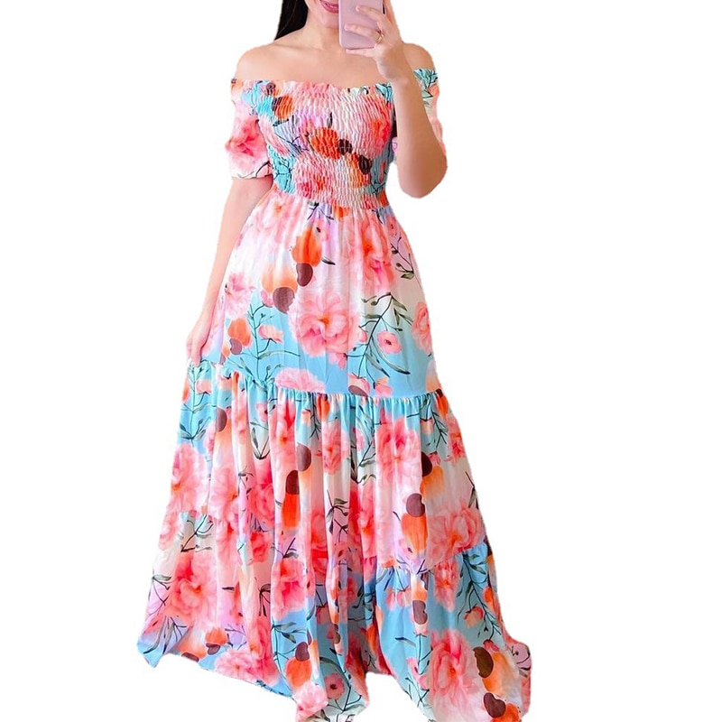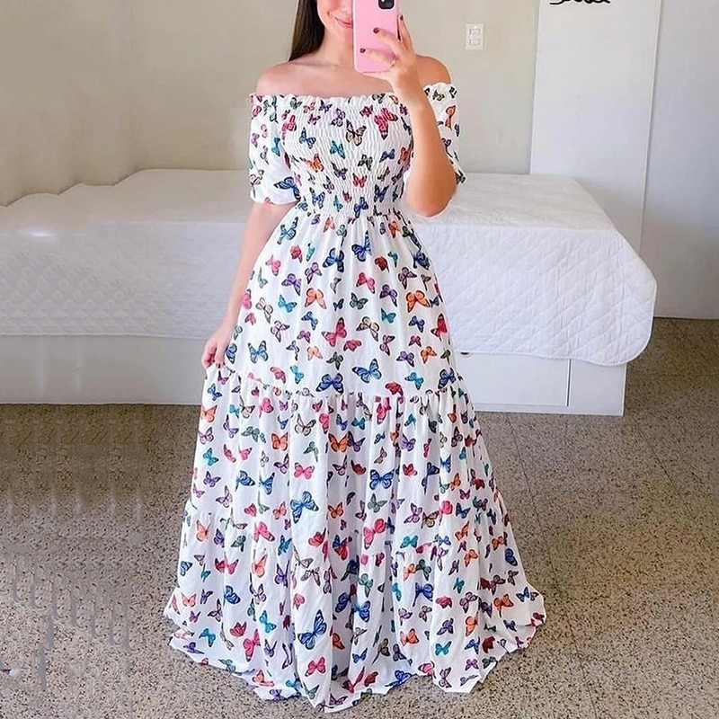 مثير قبالة الكتف فستان صديرية دائرية فراشة قوس قزح الأزهار طباعة فستان السيدات أنيقة ضئيلة الصيف البوهيمي فساتين ماكسي للحفلات