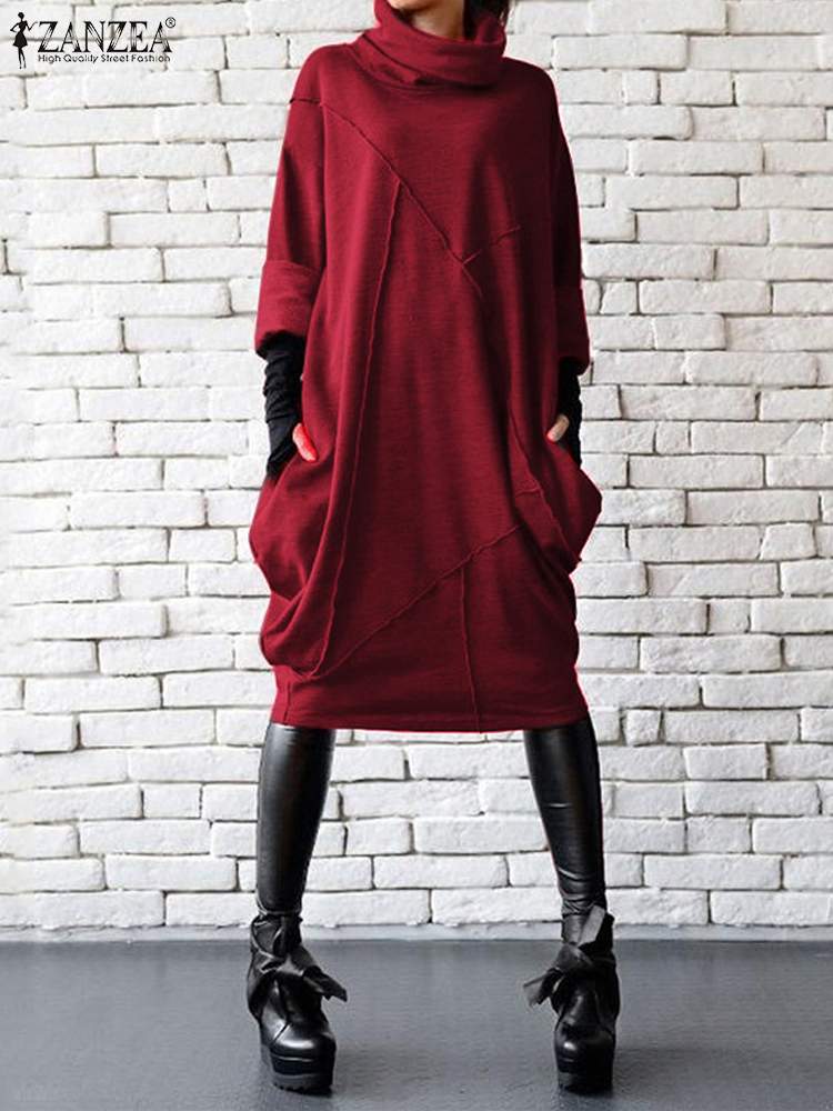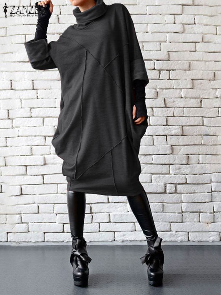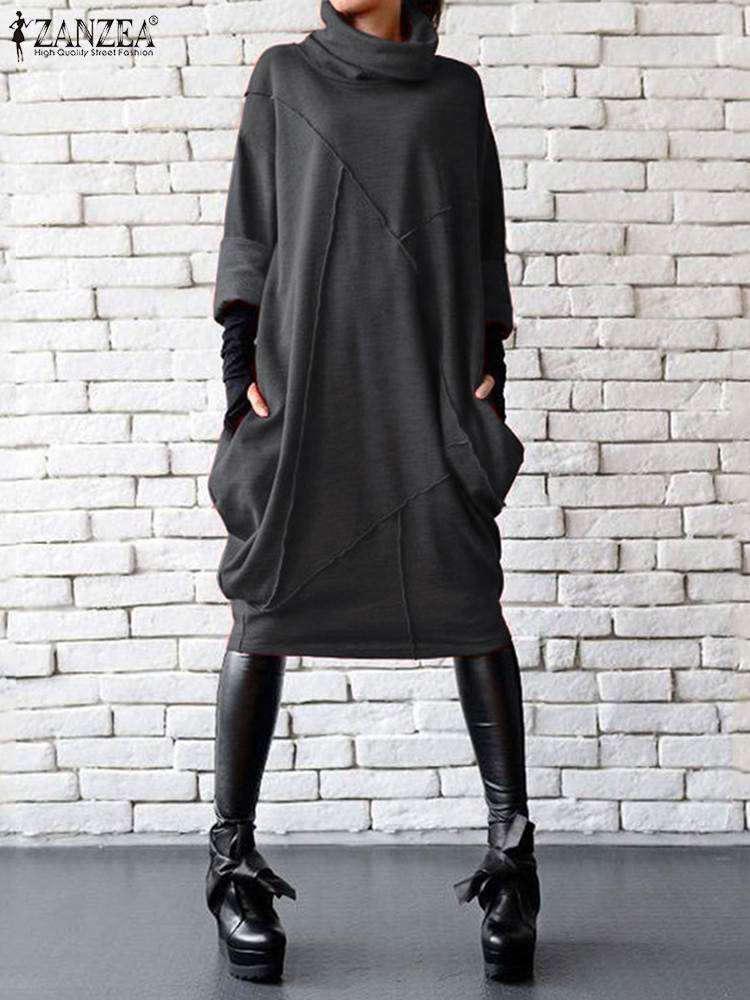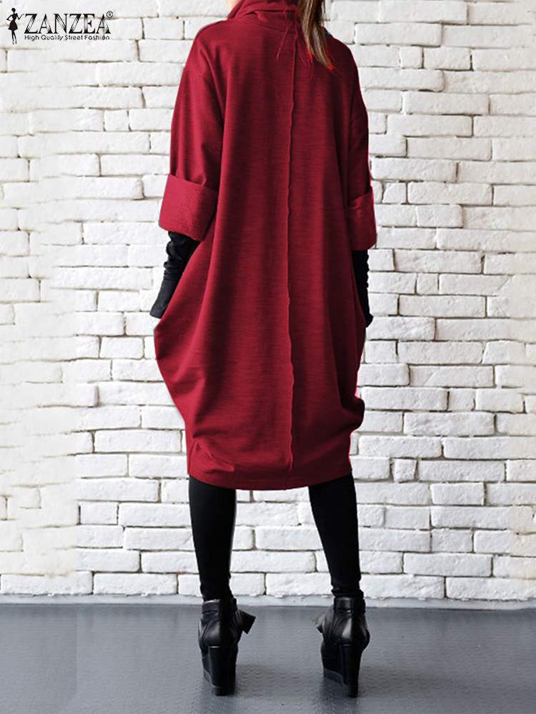 ZANZEA موضة الخريف كم طويل فستان الشمس أنيقة المرأة الياقة المدورة الصلبة حفلة Vestidos رداء فام فستان عادي بطول الركبة