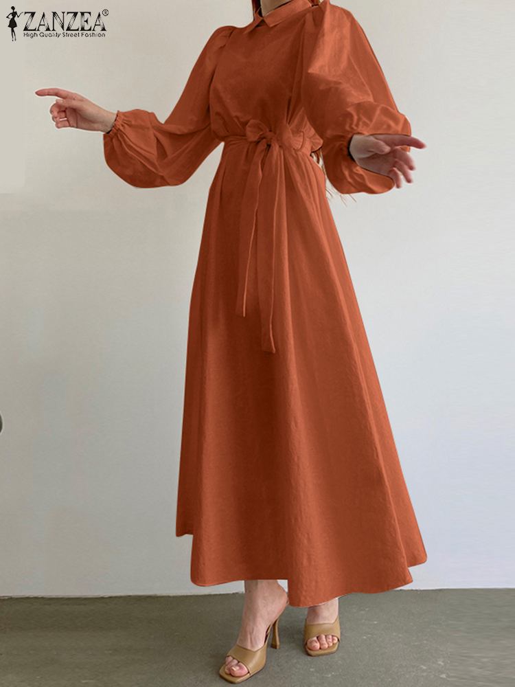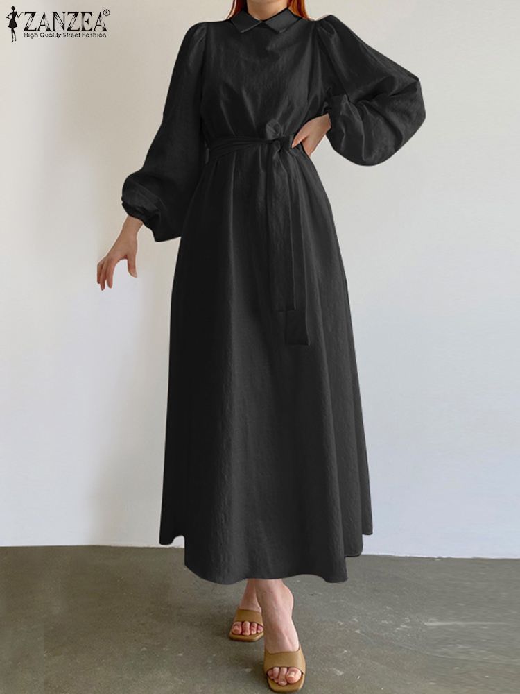 فستان نسائي طويل من ZANZEA أنيق بأكمام طويلة منتفخ فساتين حفلات غير رسمية بحزام بلون سادة