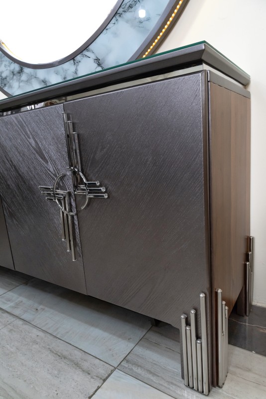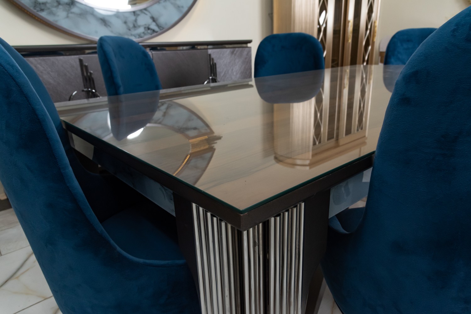 غرفة سفرة pipe مصنعة بالكامل من اجود الاخشاب الطبيعية ابلاكاش روسي و الاحمال خشب زان قشرة أرو مفجر طبيعي و قشرة تركي طبيعية مكونة من بوفيه بمقاس ٢ م ارتفاع ١ م ٤ دلفة soft close ٢ درج معالق معلق من الخشب الزان و برواز مضىء بستانلي معدني وزجاج رخامي نيش بمقاس ١٣٥ سم ارتفاع ٢٢٠ سم عمق ٥٥ سم ٢ درفة soft close ٣ رف زجاجي و ظهر مرايا و ٢ درج داخلي تخزين مزود بإضاءة علوية ترابيزة بمقاس ٢م*١ م ارتفاع ٧٨سم عدد ٦ كرسي من الخشب الزان تنجيد سوفت و قماش تركي